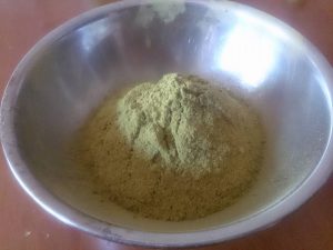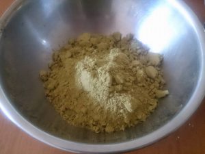 ヘナパウダーに、ヘアオイルを大さじ1杯(15ml)加えます。