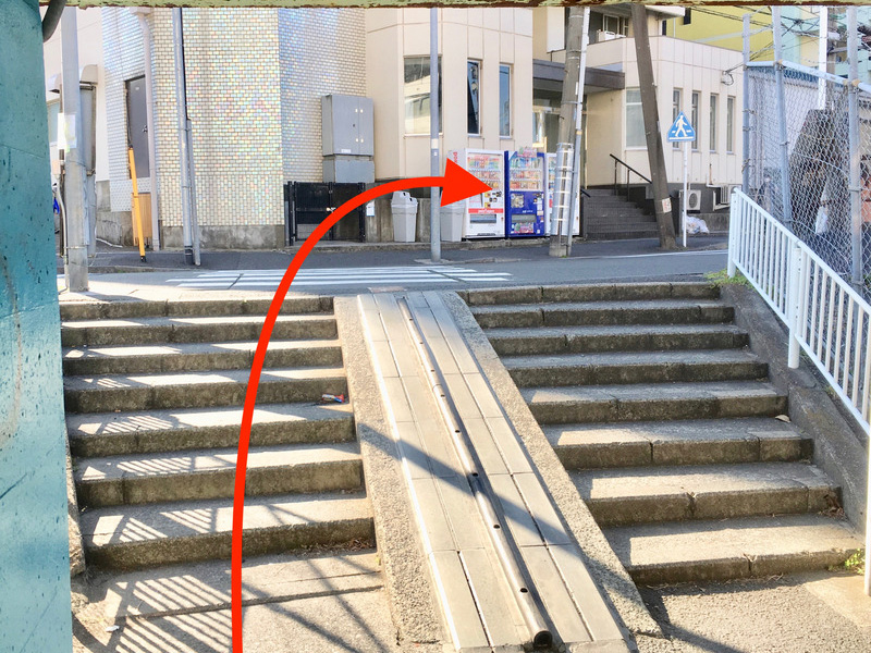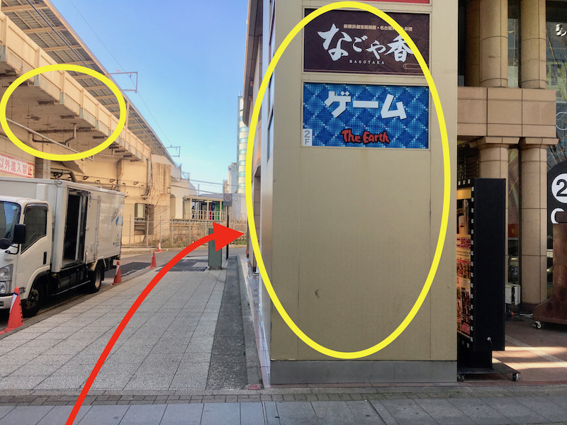 ⑤直進した先、商業ビルと新幹線線路の間の路地へと右折します。