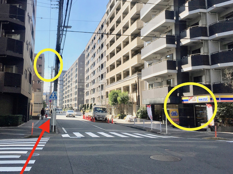 右手にミニストップを見ながら横断歩道を渡って直進します。左斜め前に見える茶色の建物がスタジオのビルです。