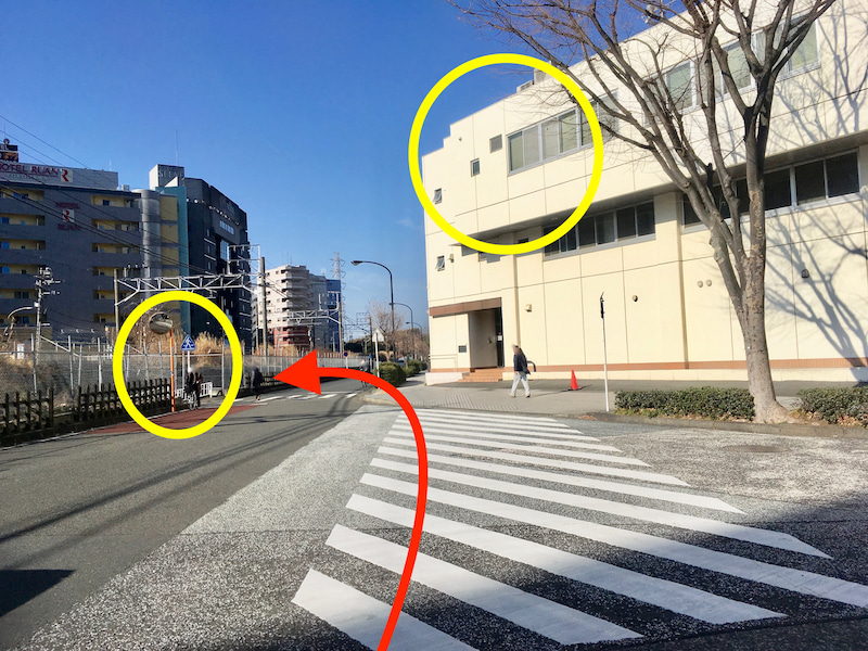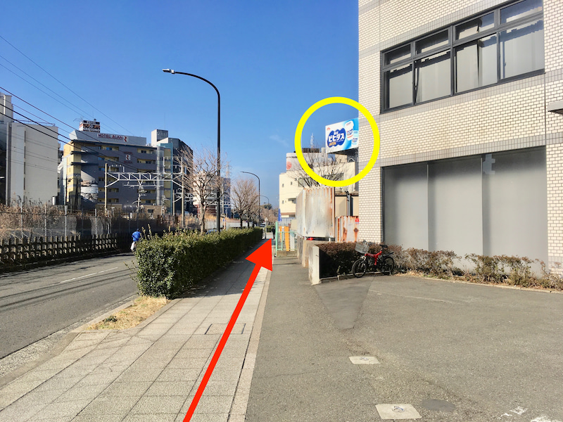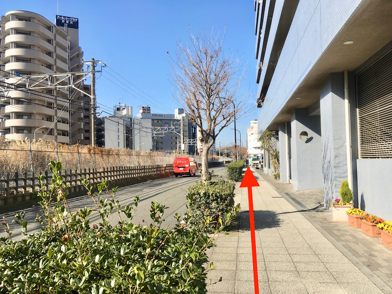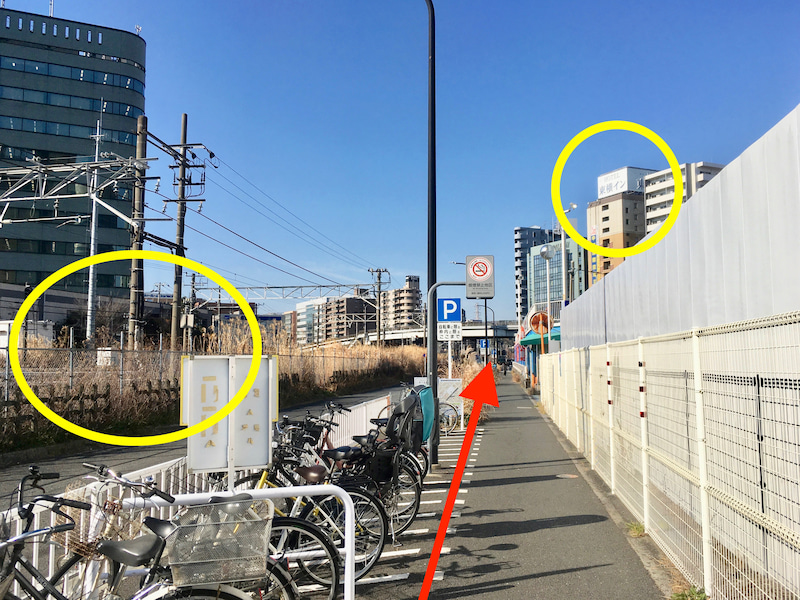 ⑥左手に新幹線線路、右手に商業ビルを見ながら道なりに進みます。