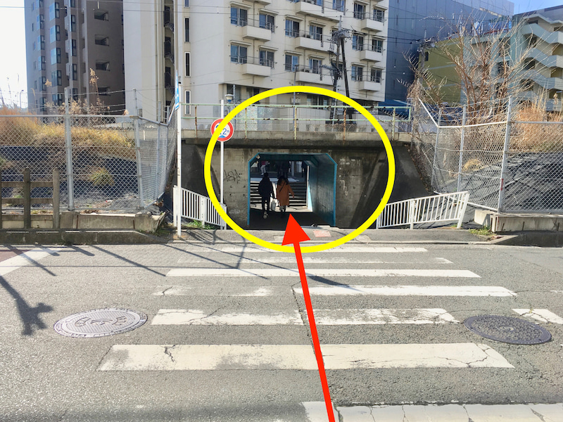 ⑪横断歩道を渡って左折し、「ビヒダス」の看板のある森永乳業を背に横浜線高架下通路へと横断歩道を渡ります。