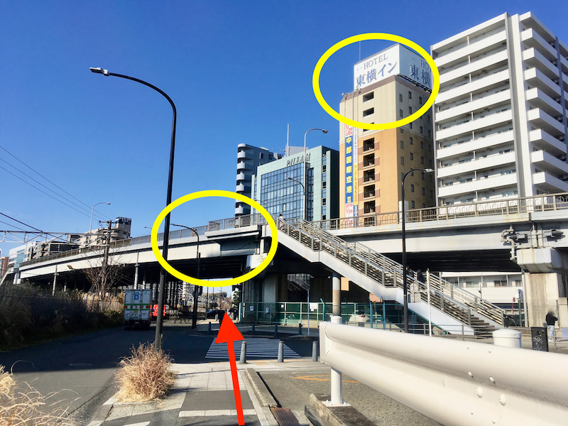 ⑦左手にJR横浜線線路、右斜め前に東横インを見ながら直進します。