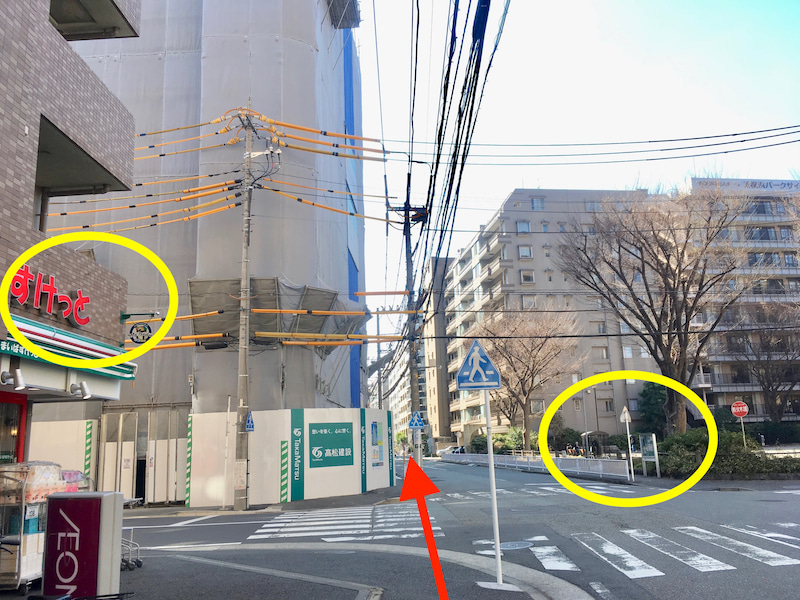 ⑮左手にスーパーまいばすけっと、右斜め前に公園を見ながら横断歩道を渡って直進します。