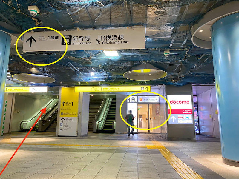 ①横浜市営地下鉄ブルーライン新横浜駅JR連絡改札を出ます。改札を出て直進、右手にキュービックプラザ(駅ビル)のエレベータホールを見ながら、出口1のエスカレータに向かいます。