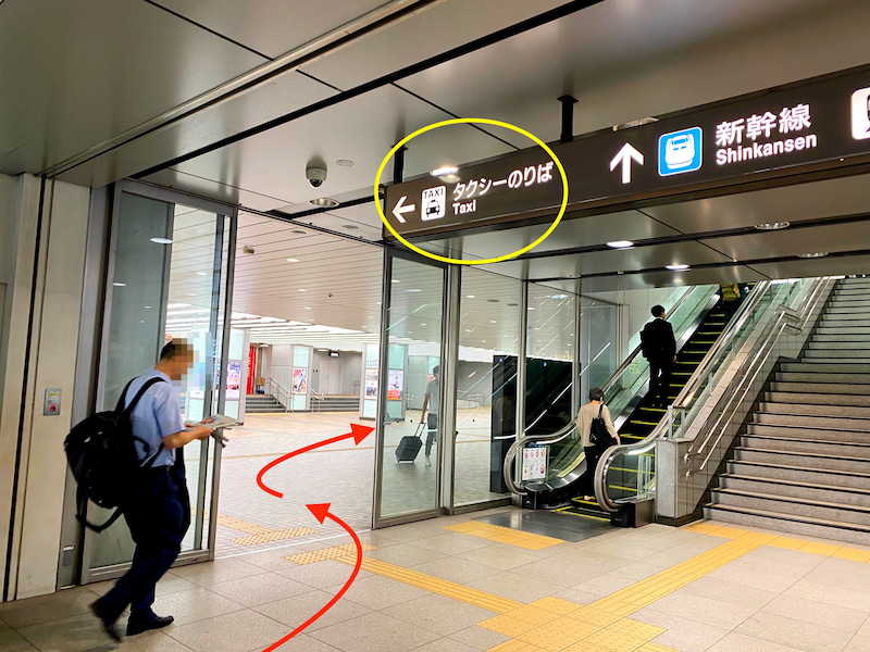 ③1階に着いたら、左手のドアを出て、右に進みます。タクシー乗り場を右手に見ながら直進します。