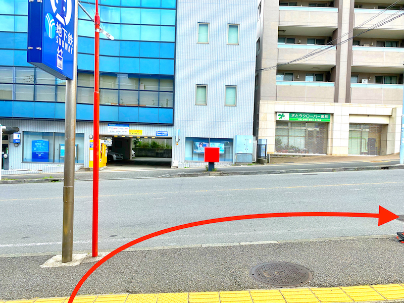⑤エレベーターを降りると、道を挟んで横浜銀行が正面に見えます。右に進みます。