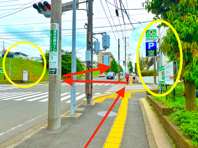 ⑥スーパー三徳の駐車場を右手に、一つ目の信号を渡ります。